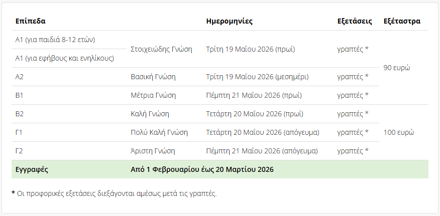 Για περισσότερες πληροφορίες σχετικά με τις ημερομηνίες των εξετάσεων, καθώς και για την υποβολή αιτήσεων θα βρείτε στον σύνδεσμο https://www.greek-language.gr/certification/node/15.html#toc002